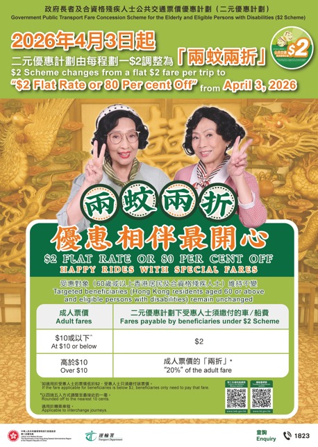With effect from August 25 2024, Hong Kong residents (including eligible persons with disabilities) aged 60 or above must use JoyYou Card to enjoy $2 Scheme. The existing Anonymous Elder Octopus and ordinary Personalised Octopus will not be covered under the $2 Scheme. Eligible persons with disabilities aged below 60 can continue to enjoy the $2 Scheme using the Personalised Octopus with "Persons with Disabilities Status" Card replacement is not required. For any enquires, please contact Octopus "JoyYou Card" hotline : 3147 1388